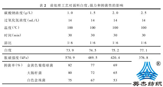 . 4. 1 中所述的煮漂工艺进行前处理,其对面料白度、强力和抑菌性所产生的影响如表 2 所示。
