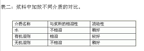 由此可明显地看出:在浆料中加放保湿剂有着明显的作用,但当用量达到6%,即使用量再增加,其效果也不大,因此我们选用6%的保湿剂放在浆料中有效解决了生产“挂皮”现象。1.2改善浆料的流动性。我厂使用的聚氨酯PU涂层浆料含固量高达50%,且稠厚度也高,由此在涂布中带来了流动性差的问题;在生产中刚开车涂布时还较正常,但开过了几百米后布面就会出现“鱼鳞状”的条花和横向挡子印,严重影响布面的涂布质量;能否在浆料中加放适合的介质,通过改善浆料的流动性来提高涂布质量,我们根据浆料的性能试用了几种介质,结果如表二:表二:浆料中加放不同介质的对比。