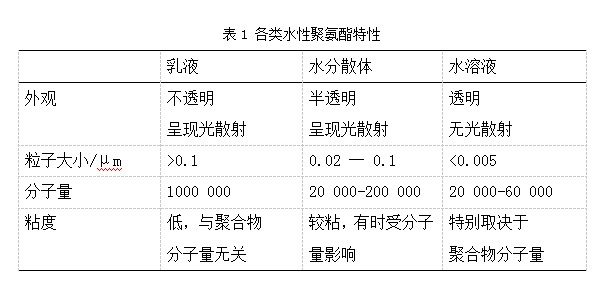 根据分子粒子在水中的分散程度不同,水性聚氨酯分为乳液、水分散体、水溶性等3种,表1列示了3种水性聚氨酯的特性。