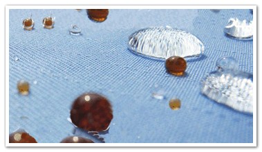 拒水预防水渗入的功能性处理,现在的阻水处理往往采纳阻水膜来阻挡水分子深入,但薄膜本身过于脆弱,所以要依靠表布、薄膜、内里相互配合才能达到拒水的功能。阻水能力用抗水压值来表示,即以固定面积的拒水布阻挡延续上升的水压,当表面渗出第三滴水珠时即为该织物的抗水压值,通常超过1000mm就可以达到基本的阻水能力。
